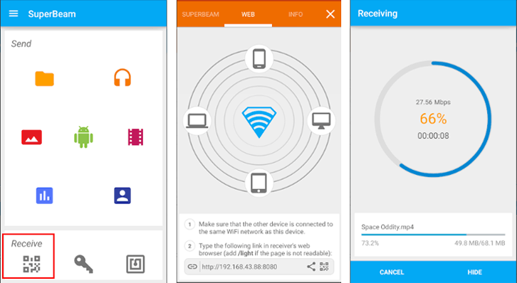 如果您还不知道如何选择类似于SHAREit的应用程序,您可以享受超级简单和快速的文件传输。它可以帮助您通过 WiFi direct 与其他 Superbeam 用户共享文件。您只需通过二维码和 NFC 配对设备即可。没有 SuperBeam 的设备可以通过 Web 界面共享文件。