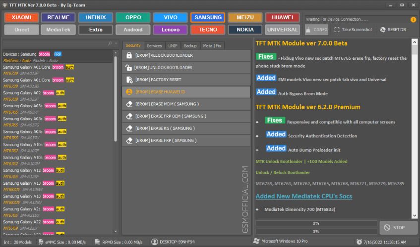 TFT MTK 模块工具旨在解锁和修复 MediaTek (MTK) 设备。它具有绕过三星、小米、Oppo 和 Vivo 品牌手机上的 FRP 锁的新旧方法。 PIN 码、密码锁、图案和生物识别锁等屏幕锁也可使用此工具删除。