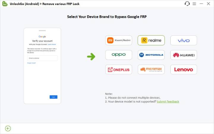 以下是使用 UnlockGo (Android) 绕过 Realme FRP 的步骤。