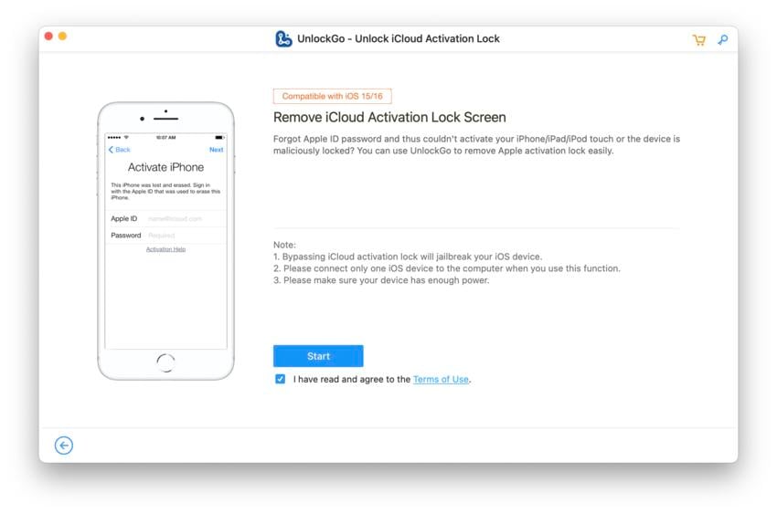 弹出一个屏幕,显示您可以绕过 iOS 15/16 上的 iCloud 激活锁。在继续之前请阅读注意事项。使用原装 USB 数据线将 iPhone 连接到 Mac,然后单击“开始”。