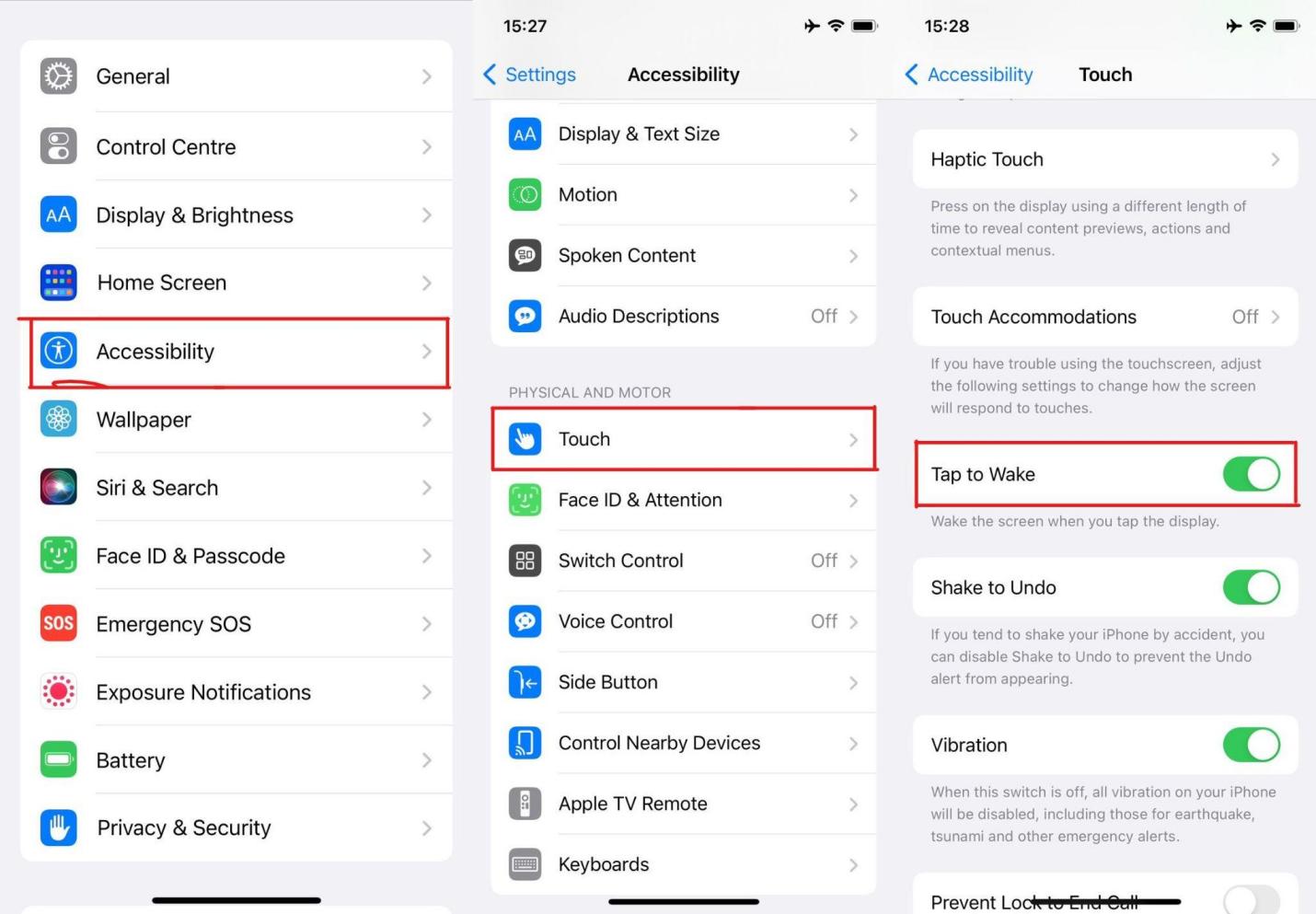 按照这些步骤操作将禁用“点击唤醒”功能,并允许您通过按电源按钮唤醒 iPhone。这是从 iOS 17/16 锁屏中删除手电筒的最简单方法之一。