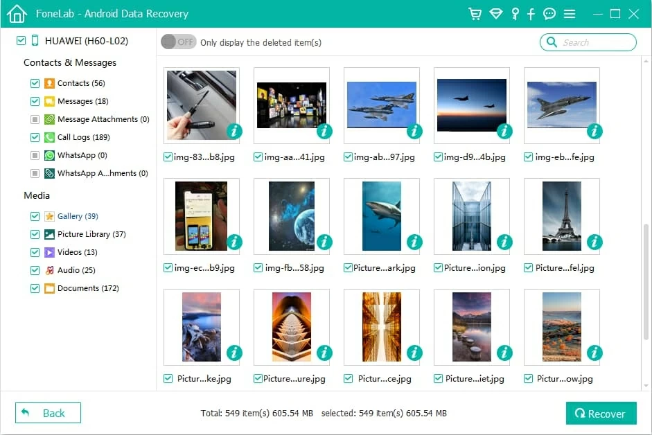 - 如果没有备份,Android Data Recovery 将处理这种情况,并在彻底扫描您的设备后帮助您恢复那些丢失的媒体。