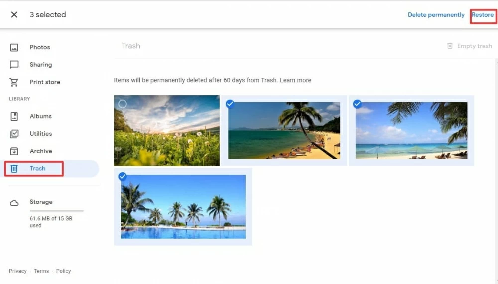 您可以立即从垃圾文件夹中找回已删除的 Google 相册。但是,如果您在那里找不到已删除的照片,则表示 60 天期限已过或照片已被永久删除。