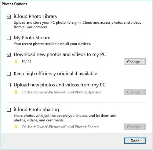 同样,使用 Apple ID 登录。转到“照片”旁边的“选项”按钮。在下一个窗口中,勾选“iCloud 照片库”和“将新照片和视频下载到我的电脑”。