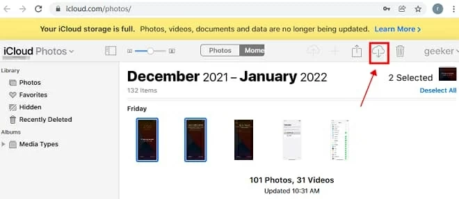 移至您的计算机,访问iCloud 网站在网络浏览器中。使用与您的 iPhone 相同的 Apple ID 登录。勾选您要传输到计算机的视频。最后,点击看起来像云的下载按钮,将这些视频从 iPhone 保存到 Windows 10 计算机。