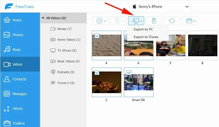勾选您要传输的视频。在软件顶部的水平菜单中,点击看起来像计算机的按钮。然后从下拉菜单中选择“导出到PC”按钮。