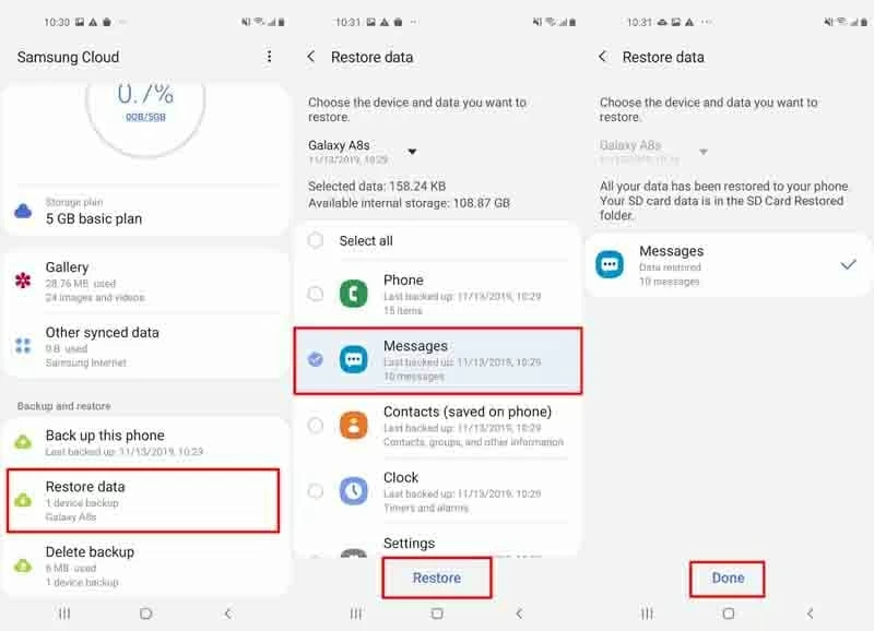 选项 1.从 Samsung Cloud 垃圾箱恢复 SMS 消息