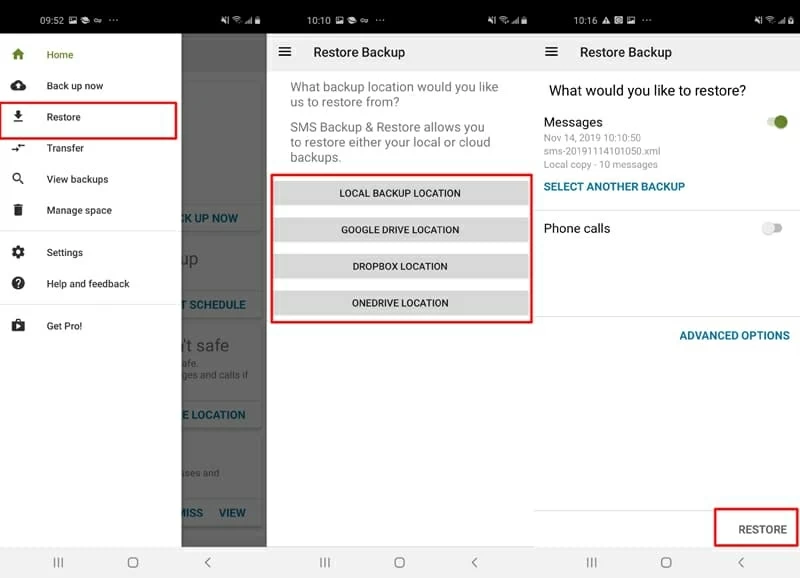 在短信消失之前,在短信备份和恢复应用程序上打开“立即备份”中的消息选项后,检索已删除的消息并返回三星 Galaxy S23 设备就轻而易举了。您只需按照屏幕上的提示即可恢复短信。方法如下: