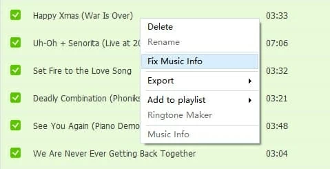 考虑到您可能需要修复音乐 ID3 标签,如名称、艺术家、专辑、年份、流派、曲目编号等,该程序提供了“修复功能”来帮助您解决此问题。只需选择您需要修复的歌曲,右键单击它并选择修复音乐信息弹出菜单中的选项。