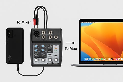 要通过混音器将 itel 手机连接到 Mac 电脑,您可能会尝试从 itel 手机录制或混合音频(例如,用于播客、直播、音乐制作或通话)。