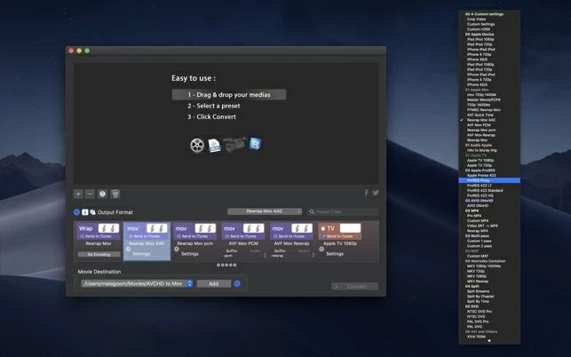 要将 AVCHD 转换为 MOV,请在 Mac 上运行该工具,拖放 AVCHD 文件,从预设列表中选择 iMovie,AVCHD to Mov Lite 将创建 MOV 文件并将其放置在“电影目标”文件夹中。