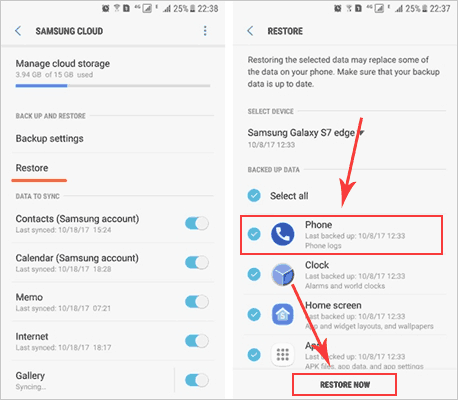 - 在三星手机上,转到“设置”>“云和帐户”>“SAMSUNG ClOUD”选项。然后选择“恢复”选项卡。