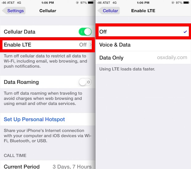要禁用 LTE 服务,请打开“设置”应用程序并单击“蜂窝网络”。然后,单击“蜂窝数据选项”并点击“启用 LTE”。将“LTE”设置更改为“离开”来完成该过程。