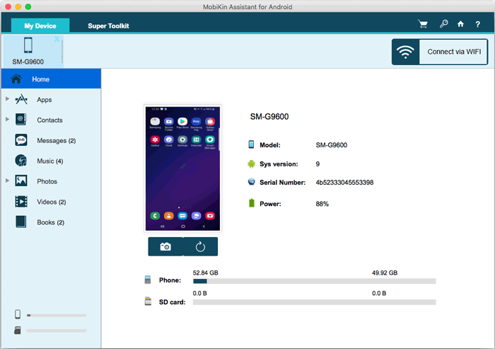 在您的计算机上安全免费下载并安装 Android 版 MobileKin Assistant,然后启动该程序。通过 WiFi 或使用 USB 线将您的 Android 设备连接到 PC,软件将检测并显示您的手机(如果出现提示,请确保启用 USB 调试)。连接后,您可以直接从计算机轻松备份、导出、恢复、导入或管理所有手机数据。