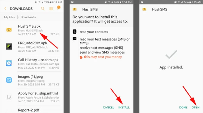 5.下载后,导航至我的文件>下载,然后安装HushSMS.apk。