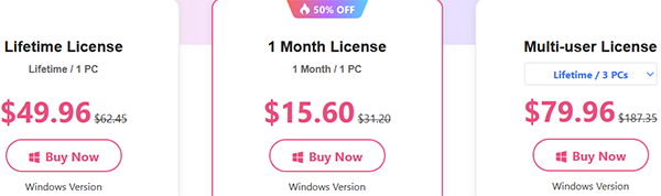 Aiseesoft MobieSync 的终身许可证(约 50 美元)为经常使用的用户提供了良好的价值,特别是具有 30 天退款保证。然而,偶尔的用户或需要云集成的用户可能会发现其有限的试用和缺乏高级功能不太有吸引力。有关更多定价计划,请参阅下图: