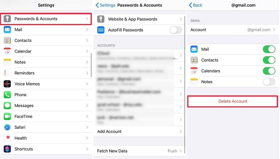 - 在您的设备上,前往“设置 > 密码和帐户”。到达那里后,找到并输入您的电子邮件帐户,然后选择“删除帐户”选项。