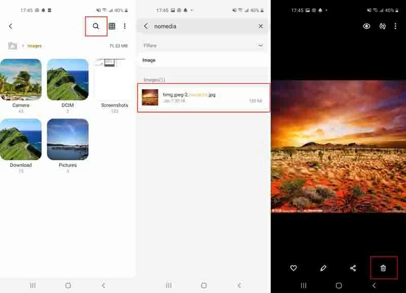 要测试图库图片或下载的照片是否只是由于 .nomedia 文件而被隐藏而不是从 Android 自动删除,只需在手机上找到并删除 .nomedia 文件即可。