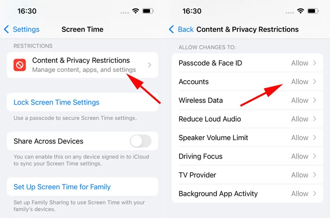 在 iPhone 设置应用程序中,找到并选择屏幕时间, 轻敲内容和隐私限制,并找到账户变更或者账户,并选择允许。
