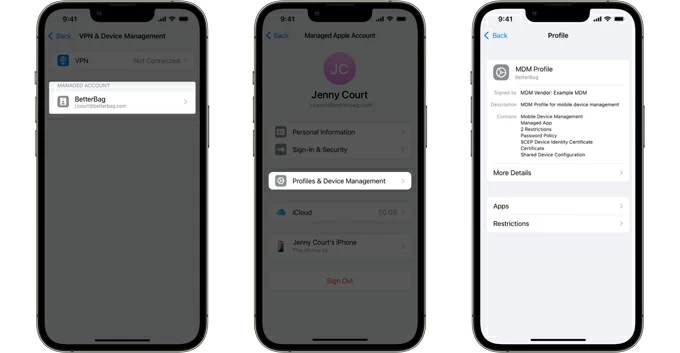 设备管理配置文件 (MDM) 是导致您的 Apple 帐户在 iPhone 设置中显示为灰色或访问被阻止的另一个罪魁祸首。使用移动设备管理 (MDM) 管理您的设备时,包括 Apple ID 在内的某些功能可能会被禁用。