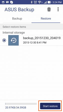 步骤 3.打开 ZenFone 上的 ASUS Backup 应用程序。单击顶部菜单中的“恢复”部分。然后检查并选择备份文件,然后按右下角的“开始恢复”即可恢复上次备份。
