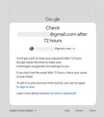 时间取决于方法。工具或拨号器代码需要几分钟; Google恢复可能需要24-72小时。