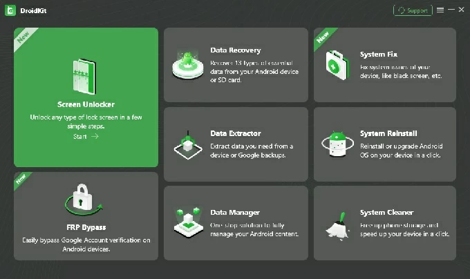 DroidKit – Android Screen Unlocker 被称为最好的 Android 解锁工具之一,易于下载和安装。这款移动密码解锁软件围绕各种模块设计,包括数据恢复、系统修复、数据提取器、系统清理器、屏幕解锁器、数据管理器、FRP Bypass。