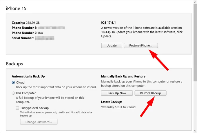 对于 Windows 或 macOS 10.14 Mojave 或更早版本的用户来说,iTunes 是 Apple 的官方工具,可用于使用电脑重置 iPhone - 无论您是否记得解锁密码。它完全免费使用,可以从苹果官方网站或微软商店下载。通过 iTunes 恢复出厂设置,您无需密码即可进入锁定的 iPhone,并重新获得完全访问权限。