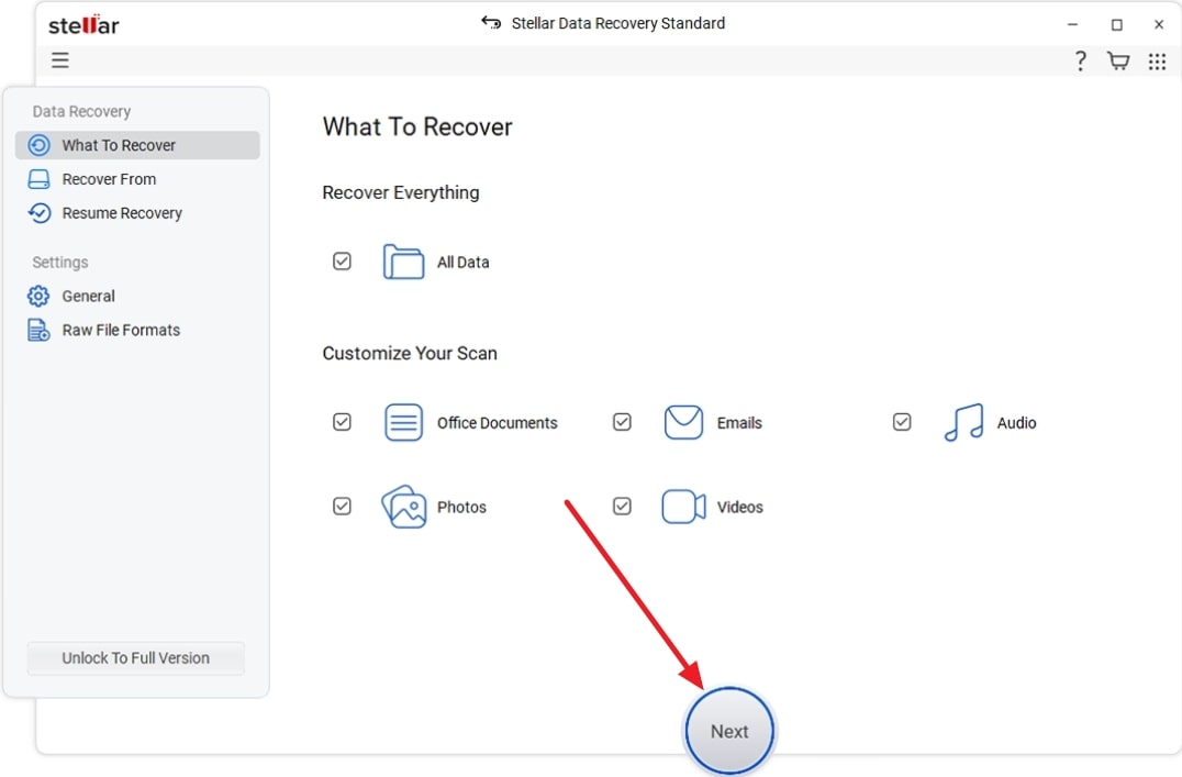 步骤1安装程序>访问“要恢复的内容”>选择“音频”选项>按“下一个”按钮。
