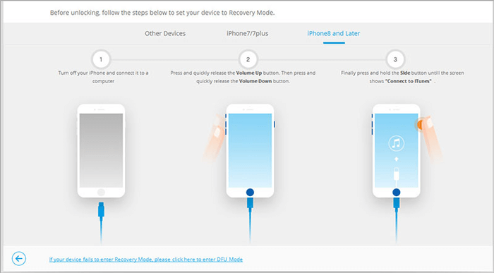 步骤3。使用密钥组合将iPhone处于恢复模式。为此,只需浏览下面屏幕上的简单清晰说明即可。