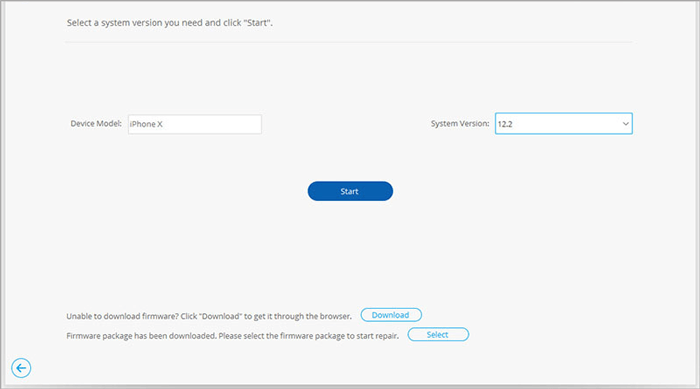 步骤4。一旦手机处于此模式,该工具将识别。接下来,您需要在接口上输入iPhone信息,例如iPhone型号和系统版本。然后点击“下载”按钮以下载设备的修复程序包。