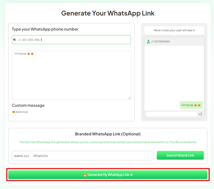 指示:使用您喜欢的浏览器导航至 iToolTab WhatsApp 链接生成器,然后前往“输入您的 WhatsApp 电话号码”部分。在这里,选择您的国家/地区代码,输入电话号码以及带有不同表情符号的所需消息。然后,通过添加您的品牌名称并点击“生成我的 WhatsApp 链接”按钮来进一步自定义链接,这将启动 WhatsApp 链接生成。