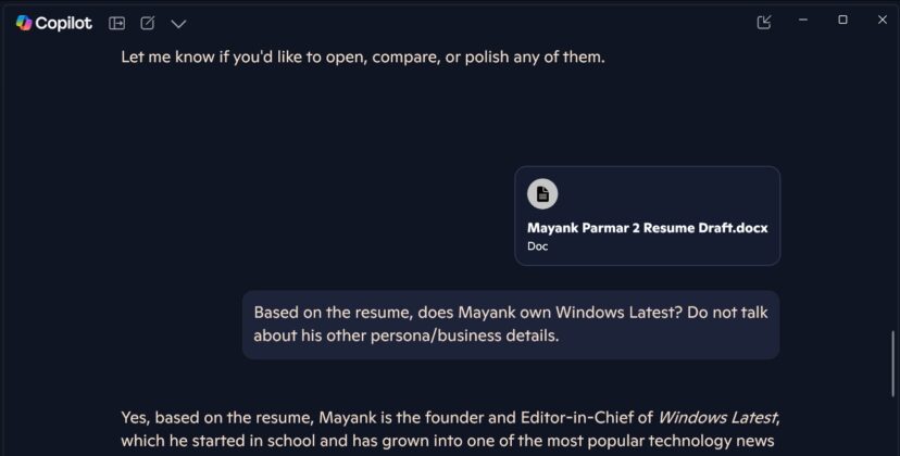当我为 Word 文档选择“打开”时,Copilot 打开 MS Word,因为它是 docx 文件格式的默认应用程序。现在,我想说的是,这个新的 Copilot Home 选项卡并不一定会限制您使用 AI 界面。