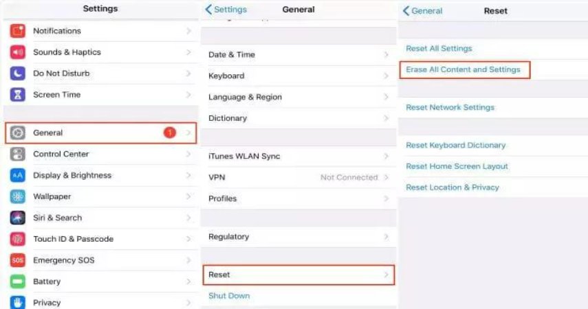 - 步骤1。首先,转到 iPhone 的“设置”并选择“常规”。向下滚动并点击“重置”,然后从选项列表中选择“删除所有内容和设置”。