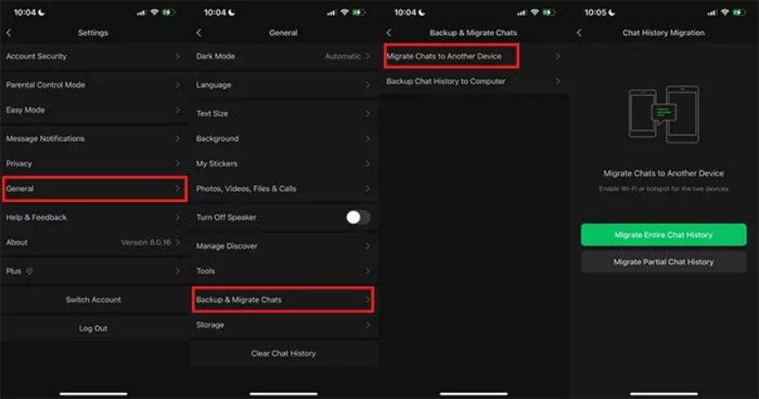 - 步骤2。在该设备上,转到“设置”>“常规”>“备份和迁移聊天”。