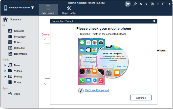 步骤2。按照屏幕提示点击iPhone上的“信任”按钮,然后打开电脑查看设备的基本信息。
