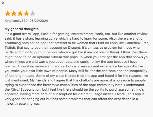 “总的来说,这是一款不错的应用程序,我用它来玩游戏、娱乐、工作等。但正如另一篇评论所说,它的学习曲线很陡,对某些人来说很难学。此外,我在 Gamerlink、Psn、Twitch 等应用程序上发现,该应用程序上有很多冒充女性的诈骗机器人,要求在 Discord 上添加自己的帐户。这是一个大问题……”