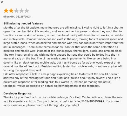 “UI 更新几个月后,许多功能仍然缺失。在聊天中从右向左滑动以打开成员列表的功能仍然缺失,一项实验似乎表明他们希望将其用作某种搜索,而不是与 Discord 在桌面和移动网络上的工作方式相同......”