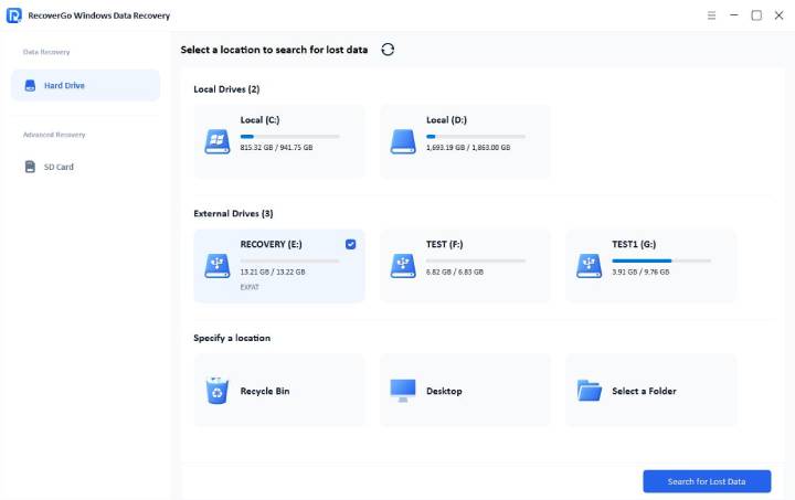 步骤1在您的计算机上安装 RecoverGo,然后启动它。之后,选择要恢复数据的位置。选择驱动器或文件夹后,单击“搜索丢失的数据”按钮。