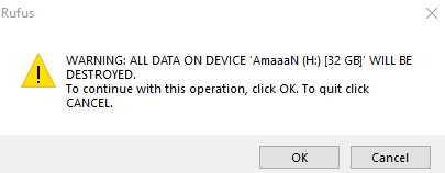 5. 现在稍等一下,就会出现警告提示。点击好的确认并最终开始该过程。这将需要一两分钟,具体取决于可启动媒体的速度。