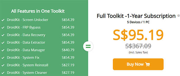 DroidKit 提供免费试用,但并非完全免费。试用版允许您访问某些功能,但要获得完整功能(例如解锁屏幕、恢复数据和绕过 FRP 锁),您需要购买高级许可证。付费版本解锁所有功能并提供无限使用。如需完整价目表,请查看下图: