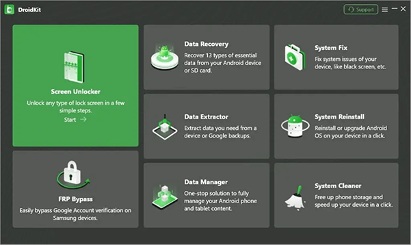 通常,DroidKit 可以解锁 FRP Google 锁、4-6 位 PIN、图案、指纹和面部识别。但是,其有效性可能会因设备型号和 Android 版本而异。这是用户指南: