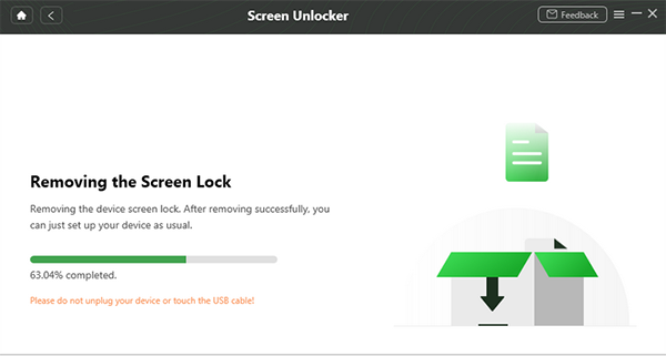 步骤 4. 解锁 –解锁将开始。在整个操作过程中保持手机连接至关重要。该过程完成后,您将成功从设备中删除密码。