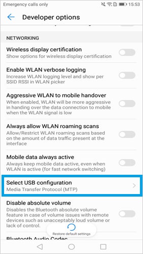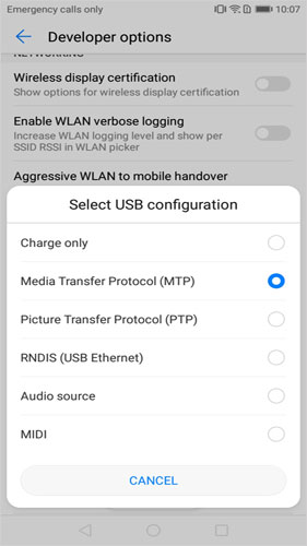3.选择“媒体传输协议(MTP)”选项。如果不起作用,请旋转以选择该选项“RNDIS(USB 以太网)”,“音频源”或者“MIDI”。