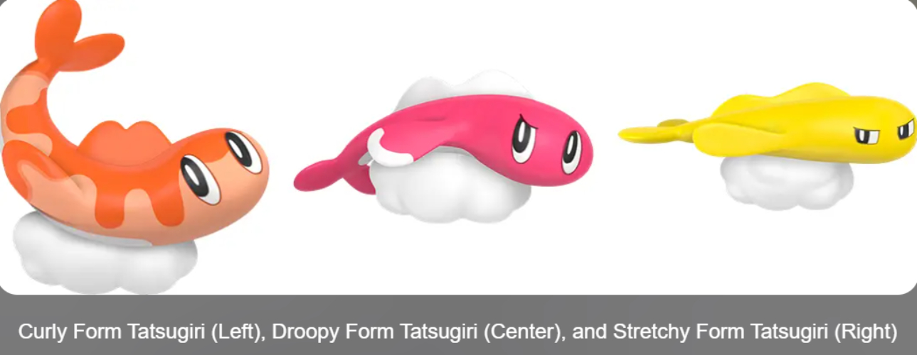 - 弹力形式 Tatsugiri:这只聪明的龙系宝可梦会通过伸出喉咙来隐藏,因为它的力量不是很强,所以它会与伙伴一起狩猎,主要是追捕鸟类宝可梦。伸展龙切呈纯黄色,喉咙为白色,通常以伸展、笔直的姿势出现。