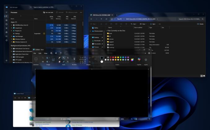 正如您在屏幕截图中看到的那样,文件资源管理器、画图、控制面板、任务管理器和其他一些应用程序(主要是旧版应用程序)现在遵循 Windows Aero,有些人可能会发现它与 macOS Liquid Glass 类似。
