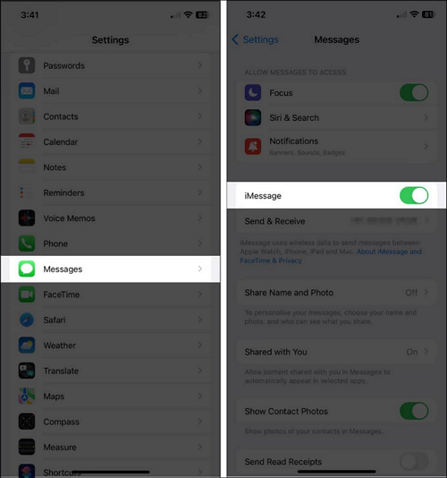 2. 如果需要,请打开开关来检查 iMessage 是否已启用