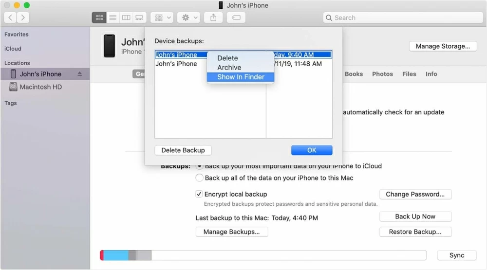查找存储在 Mac 上的 iTunes(或 Finder)备份: