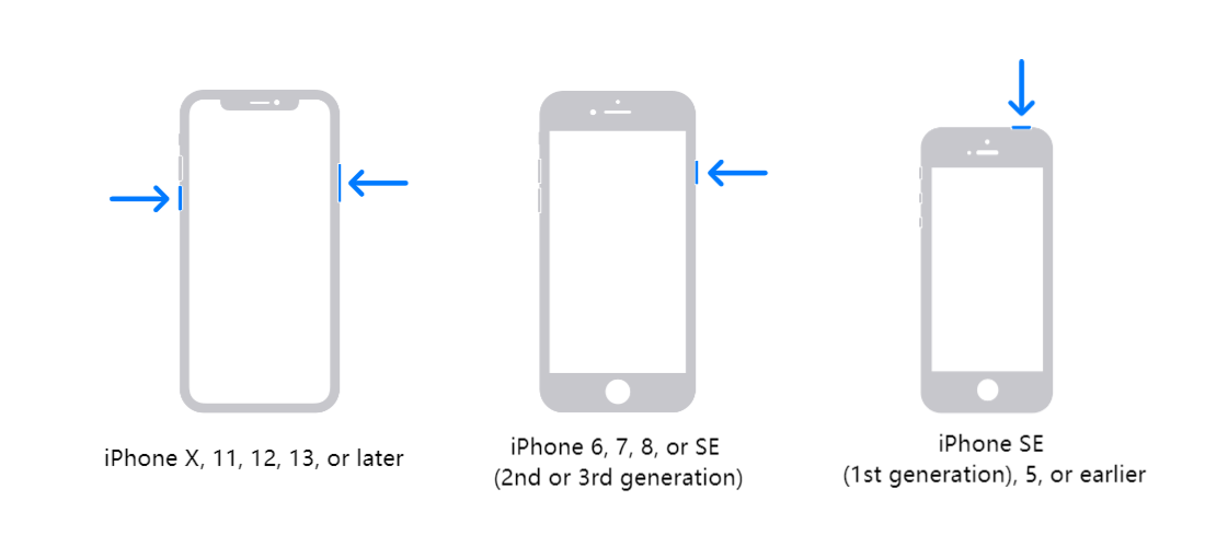 - 同时按住音量按钮和侧面按钮,直到显示关机滑块。