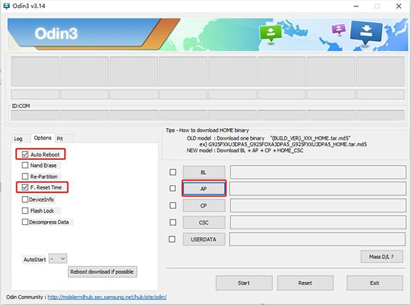 - 并仔细检查您的 Odin 设置。确保已选择“仅自动重启”和“F.重置时间”。